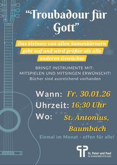 Zum Karnevalsgottesdienst „Verzaubert“ am Montag, 09.02.2026 um 18:33 Uhr in der Marienkirche Sessenbach laden die beiden abwechselnd vorbereitenden Karnevalsvereine „KVN“ - Nauort und „Blau Gold“ - Ransbach-Baumbach zusammen mit Pastoralreferentin Sonja Perk herzlich ein!