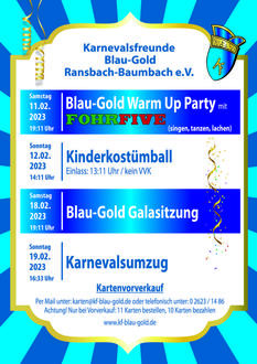 Es gilt für beide Sitzungen das Angebot: "10 Karten kaufen, 11 Karten bekommen". (Das Angebot gilt nur im Vorverkauf). Karten gibt es unter: karten@kf-blau-gold.de oder telefonisch unter: 02623 / 1486.
