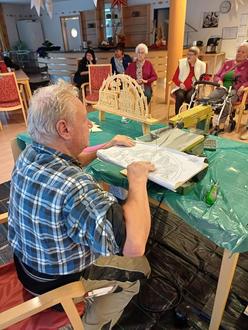 Komprimiert auf eine Stunde zeigte Martin Müller, gekonnt und begeisternd, den Bewohnern, welche Voraussetzungen man benötigt, um diese ansprechenden Accessoires der Vorweihnachtszeit zu erstellen: Geduld, gutes Auge, ruhige Hand, Blick für das Wesentliche und Schöne. So konnten die Bewohner die Entwicklung vom unbearbeitendem Holzbrett zu einem Bogen mit der Frauenkirche aus Dresden, Symbolen aus dem Alltag des Erzgebirges und der Weihnachtszeit erleben. Diese Präsentation war für die Bewohner eine besondere Einstimmung auf Weihnachten.