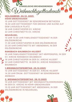 | Wir laden Sie herzlich um 10 Uhr zum Gottesdienst mit Weihnachtsliedersingen in der ev. Kirche in Höhr-Grenzhausen mit Pfarrerin Monika Christ und um 10:10 Uhr zum Gottesdienst mit Abendmahl in der Erlöserkirche in Neuhäusel mit Pfarrer Fabian Schley ein. | |
