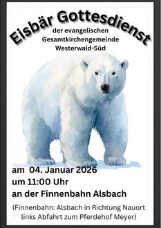 | Wir laden Sie herzlich ein zum Eisbären Gottesdienst in Alsbach um 11 Uhr an der Finnenbahn / Lauftreffbahn ca. 200 m oberhalb des letzten Hauses von Alsbach. | |