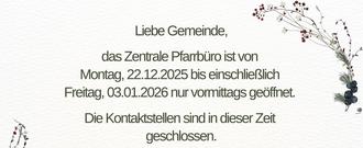 Berichte und Ankündigungen für das Verbandsgemeindeblatt KW 02 Erscheinungszeitraum 10.01. - 18.01.2026 bitte bis spätestens Montag 29.12.2025 einreichen. Messbestellungen und Veröffentlichungswünsche für das Pfarrblatt für Februar 2026 müssen bis spätestens Donnerstag, 15.01.2026 im Zentralen Pfarrbüro angegeben werden.