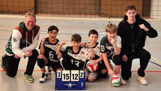 Die U 12 der Westerwald Volleys in Dernbach, hinten von links nach rechts: Trainer Erwin Hausen, Kaan Altun, Bennet Dilly, Anton Faber, Julian Goldschmitt und Co-Trainer Pablo Ferdinand.