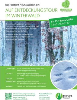 Treffpunkt ist beim Forstamt Neuhäusel, Industriestr. 13, am 21.2. um 14 Uhr (Dauer 2 Stunden). Anmeldung bis zum 19.2. bitte unter eva.decker@wald-rlp.de oder 02620 95350.