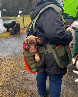 Nach dem Motto „es gibt kein schlechtes Wetter, nur schlechte Kleidung“ wurde Jungdackel „Twix“ nach erreichter maximal Laufstrecke kurzerhand in einer Dummyweste untergebracht. Beim Zwischenstopp am sogenannten „Texas“ - Häusschen konnten sich die Teilnehmer mit Glühwein und Kakao, sowie Leberwurst - und Schmalzbroten stärken.