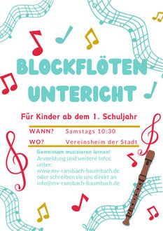 Am 09. März startet ein neuer Blockflötenkurs für Kinder ab dem 1. Schuljahr. Innerhalb der ca. zweijährigen Ausbildung werden anhand des Spiels auf der Blockflöte die Grundlagen der Musik vermittelt und Rhythmen geübt. Die Proben finden am Samstagvormittag statt. Bei Interesse melden Sie sich bitte per E-Mail bei: info@mv-ransbach-baumbach.de. Sie erhalten dann weitere Informationen zu Unterrichtswerk und Instrument sowie die Anmeldeunterlagen.