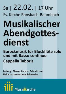 Die Musikkirche lädt am Samstag, 22.02. um 17:00 Uhr in die Evangelische Kirche, Kirchstraße 13 in 56235 Ransbach-Baumbach zu einem Musikalischen Abendgottesdienst mit Pfarrer Carsten Schmitt und der Cappella Taboris ein. Im musikalischen Fokus des Abends stehen drei Mitglieder dieses Ensembles, die verschiedene kontrastreiche Kompositionen des Barocks von Johann Sebastian Bach, Georg Philipp Telemann und Joseph Bodin de Boismortier für Blockflöte solo als auch mit Basso continuo interpretieren. Die musikalische Leitung obliegt Dekanatskantor Jens Schawaller, nach dem Gottesdienst werden wieder Kaffee, Tee und Kekse gereicht. Weitere Informationen unter http://musikkirche.de.