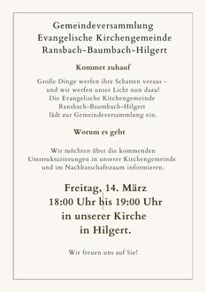 Die Evangelische Kirchengemeinde Ransbach-Baumbach-Hilgert lädt zur Gemeindeversammlung ein.