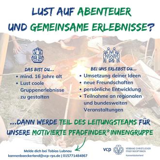 Der VCP Kannenbäckerland sucht Interessierte ab 16 Jahren, die Lust haben coole Gruppenerlebnisse zu gestalten. Als Verstärkung für das Leitungsteam der motivierten Pfadfinder*innengruppe kannst du deine Ideen einbringen und auch selbst an Aktionen wie Spielewochenenden oder Zeltlagern teilnehmen. Du möchtest mal reinschnuppern oder hast Fragen? Melde dich bei Tobias Lubnau, kannenbaeckerland@vcp-rps.de oder 0157 71484867.
