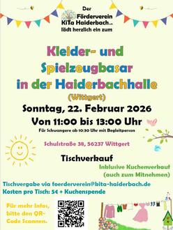 Der Förderverein der Kita Haiderbach e. V. lädt herzlich zum Spielzeug- und Kleiderbasar ein. Am Sonntag, den 22.02.2026, haben Interessierte von 11:00 bis 13:00 Uhr in der Haiderbachhalle in Wittgert (Schulstraße 38) die Möglichkeit, gut erhaltene Kinderkleidung, Spielzeug und vieles mehr rund ums Kind zu entdecken. Für Schwangere ist der Einlass bereits ab 10:30 Uhr mit einer Begleitperson möglich. Der Basar findet als Tischverkauf statt und wird durch einen Kuchenverkauf ergänzt, bei dem Kuchen auch zum Mitnehmen angeboten werden. Der Erlös des Basars kommt der Arbeit des Fördervereins und somit direkt den Kindern der Kita Haiderbach zugute. Weitere Informationen sowie Anfragen zur Tischvergabe sind per E-Mail an foerderverein@kita-haiderbach.de möglich.