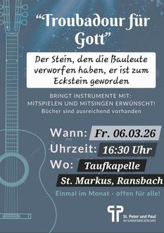 Das nächste Treffen findet am Freitag, 06.03.2026 von 16:30 Uhr bis 17:30 Uhr in der Taufkapelle in der Kirche St. Markus in Ransbach statt.