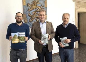 (von links): Carsten Gerz von der Schreibwerkstatt SCHRIFT:gut in Westernohe, Bürgermeister Gerrit Müller und Büroleiter Konrad Groth bei der Buchpräsentation in der Verbandsgemeindeverwaltung in Rennerod