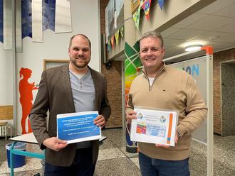 Foto (Verbandsgemeindeverwaltung / Markus Jung): Hubertus Klering (links) stellte das Bauprojekt seiner Familie zur Wohnraumschaffung im Stadtkern von Rennerod vor. Bürgermeister Gerrit Müller (rechts) informierte über die Entwicklung und die wesentlichen Eckpunkte des Förderprogramms „Lebendiger Ortskern“ in der Verbandsgemeinde Rennerod.