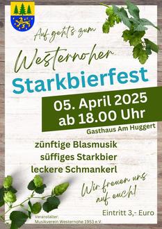 Am Samstag, den 5. April 2025 lädt der Musikverein Westernohe zum Starkbierfest ein. Ab 18:00 Uhr heißt es im Gemeindezentrum Westernohe „Prost!“ und „Oans, zwoa, g’suffa!“: In gemütlicher Atmosphäre und mit einer Auswahl an köstlichen Starkbieren und darf sich das Publikum von der Stimmung mitreißen lassen. Die Veranstaltung wird vom Musikverein Westernohe organisiert, und der Eintritt beträgt 3,00 Euro. Die Veranstaltung findet im Gemeindezentrum Westernohe im Gasthaus am Huggert statt.
