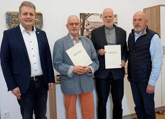Die Stadtgeschichte in Rennerod wird zukünftig notiert von Bernd Tischbein und Arnold Riebel. Ein herzliches Dankeschön für das ehrenamtliche Engagement erhielten die beiden neuen Chronisten zusammen mit den Urkunden von Bürgermeister Gerrit Müller (li.) und Stadtbürgermeister Raimund Scharwat (re.).