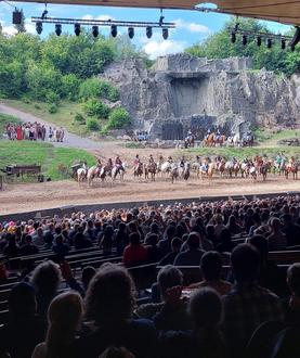Die Karl-May-Festspiele bieten eine tolle Show mit atemberaubenden Ritten auf mehr als 40 Pferden, akrobatischen Stunts und spektakulärer Pyrotechnik. Die Darsteller geben ihr Bestes auf einer der größten Freilichtbühnen Europas. Vor der großen Hauptshow findet noch ein umfangreiches Rahmenprogramm statt.