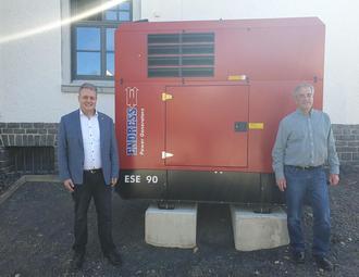 Bürgermeister Gerrit Müller (links) und Büroleiter Konrad Groth am Standort des neuen Notstromaggregats der Verbandsgemeindeverwaltung.