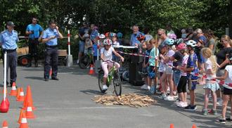Aufmerksam wird von den Zuschauern die Fahrt jedes Wettbewerbsteilnehmer auf dem anspruchsvollen Parcours beobachtet. Polizeioberkommissar (POK) Patrik Röhl von der Jugendverkehrsschule (links) hatte die Idee für diese Aktion, bei der besonderes Geschicklichkeit, Geduld und Können gefragt sind.