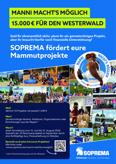 Der zeitliche Rahmen der Sponsoringaktion sieht so aus: Vereine, Initiativen, Einrichtungen und Organisationen der Region Westerwald können sich ab Mitte Juni bis Ende August auf der Webseite www.soprema.de/manni-machts-moeglich anmelden und ihr Projekt vorstellen - schriftlich, mit einem Audiobeitrag oder einem kleinen Video. Eine fünfköpfige Jury aus zwei Vertretern der SOPREMA GmbH und drei geladenen Vertretern der Region Westerwald begutachtet im September die eingereichten Anträge und wählt zehn Förderprojekte aus.