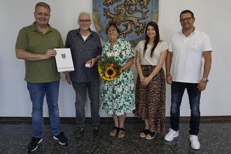 Zum 500. Förderbescheid überreichte Bürgermeister Gerit Müller zusätzlich noch einen Blumenstrauß an die Familie Busch. v.l.n.r.: Bürgermeister Gerrit Müller, Eheleute Günther und Anette Busch, Sachbearbeiterin Michelle Stecker und Bauamtsleiter Markus Schmiedl