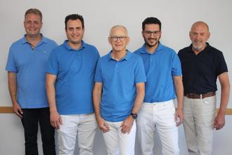 Bürgermeister Gerrit Müller (links) und Stadtbürgermeister Raimund Scharwat (rechts) gratulierten den Augenärzten Ali Zimmermann (2. v. li.) und Alaa Ahmad (2. v. re.) sowie dem bereits seit Jahrzehnten praktizierenden Dr. Michael Rinker (Mitte) zur Praxisübernahme und wünschten viel Glück und Erfolg.