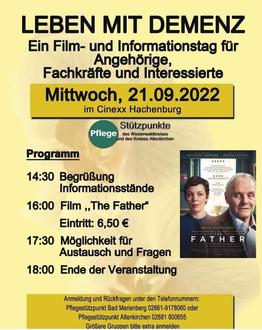 In Kooperation mit dem CINEXX Kino Hachenburg informieren die Pflegestützpunkte Kreis Altenkirchen und Westerwaldkreis in diesem Jahr wieder zur Demenz und zu Möglichkeiten der Unterstützung und Entlastung Pflegender Angehöriger.