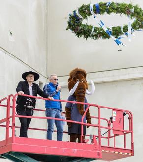 Ganz der Tradition entsprechend bildete ein festlich geschmückter Richtkranz am Gebäude den Rahmen. Der Richtspruch wünschte am Schluss: „Lasst uns erheben unsre Becher auf dieses Haus und andere Dächer. Hoch! Hoch! Hoch! Und diesem Haus viel Glück verspricht, wenn dieses Glas in Scherben bricht.“ Bild Mitte: Winfried Traub, Geschäftsführer der SOPREMA GmbH, begrüßt die Gäste.
