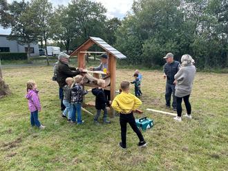Förster Michael Schmidt zeigt Groß und Klein, wie ein Insektenhotel gefüllt wird
