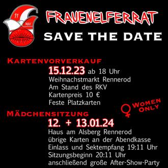 Nach einem mehr als gelungenem Debüt im ausverkauften Saal, Anfang diesen Jahres, läutet der Renneroder Frauenelferrat zur neuen Tradition. Diese Session gibt es gleich 2 Mädchensitzungen, damit niemand leer ausgeht. Am 12. und 13. Januar erwarten die Damen des Elferrates ihre Gäste wieder mit einem bunten Programm aus Tanz, Sketch und Büttenrede im Haus am Alsberg.