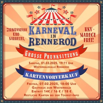 Der Kartenvorverkauf startet am Freitag, den 07. Februar 2025, um 18:00 Uhr Uhr im Gasthaus zum Westerwald, Hauptstr. 104, Rennerod.