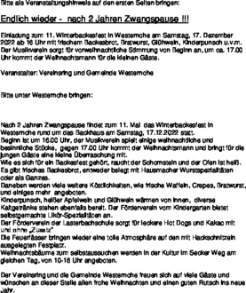 Einladung zum 11. Winterbackesfest in Westernohe am Samstag, 17. Dezember 2022 ab 16 Uhr mit frischem Backesbrot, Bratwurst, Glühwein, Kinderpunsch u.v.m.