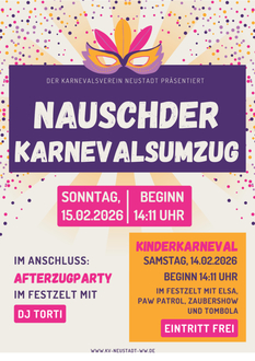 Der Nauscher Karnevalsumzug setzt sich am Sonntag, 15. Februar, um 14:11 Uhr in Bewegung. Er führt durch die Straßen Neustadts und geht anschließend auf dem Festplatz in eine After-Zug-Party über. Zu einem krönenden Abschluss heizt DJ Torti im Festzelt noch einmal so richtig ein.