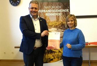 Foto (von links): Umweltministerin Katrin Eder übergibt den Zuschussbescheid an Bürgermeister Gerrit Müller in der Verbandsgemeindeverwaltung.