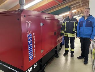 (v.l.): Wehrleiter Heinz-Werner Schütz und Bürgermeister Gerrit Müller nehmen die neue Notstromversorgung im Feuerwehrgerätehaus Rennerod in Augenschein.
