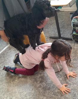 Der kleine schwarze Bilbo ist ein erfahrener Schulhund und macht wirklich alles mit. Jedes Jahr begleitet er die Kinder beim Herschbacher St. Martinsumzug und letztes Jahr war er auch beim Vorlesetag in der Schule dabei. Da Bilbo ein hypoallergenes Fell hat, gab es auch keine Bedenken wegen eventueller Allergien. Was die Kinder im Laufe der Woche im Sachunterricht über Hunde gelernt hatten, konnten sie nun am lebenden Objekt beobachten. Alle Kinder waren mit Begeisterung dabei und beobachteten genau: Ein Hund ist ein Zehengänger.