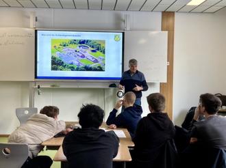 Wie selbstverständlich stellte der Vater und Großvater sich auf die Kinder und Jugendlichen und deren Wissensbedürfnisse ein: In der 5b überwog das Thema Freiwillige Feuerwehr und er bedankte sich für das Engagement einiger Kinder der Klasse in diesem wichtigen Ehrenamt und warb um weitere Interessierte, da in diesen Vereinen bereits frühzeitig und erfolgreich Kinder und Jugendliche mit eingebunden und ausgebildet werden. Im Sozialkunde Grundkurs des Technik-Profils der Stufe 11 interessierten sich die Schülerinnen und Schüler für brandaktuelle und besonders die Jugend bewegende Themen wie beispielsweise die Herausforderungen des Klimawandels und wie man diesen auch auf kommunaler Ebene begegnet. Sichtlich stolz präsentierte Herr Müller sein Pilotprojekt des autarken Klärwerks: eine PV-Anlage und Biogasanlage macht es möglich, die garantiert qualitative Frischwasserversorgung der Bevölkerung auch in Krisenzeiten zu gewährleisten. Insgesamt zeigte er jedoch auf, dass man auch als Kommunalpolitiker bei dem Wunsch, die erneuerbaren Energien auszubauen, auf bürokratische Hürden, ungeklärte Zuständigkeiten und den Konflikt zwischen Klima- und Naturschutz stoßen würde. Die 7b wurde dann live Zeuge davon, dass Herr Müller als Verbandsgemeindebürgermeister auch die Leitung der örtlichen Feuerwehr obliegt und er als solches auch immer auf sein Smartphone direkt über jeden wichtigen Einsatz informiert wird: Vom Fenster des Klassenzimmers aus war das Ausrücken der Feuerwehr zu beobachten und quasi zeitgleich wurde Herr Müller auf seinem Handy alarmiert und informiert. Die Schülerinnen und Schüler der Klasse 5a interessierten sich schließlich für eine wichtige Pflichtaufgabe der Gemeinde: Die Abwasserversorgung. So erfuhren sie, dass das Entsorgen von Essensresten über die Wasserleitungen nicht nur zu Verstopfungen führen kann, sondern auch die Ratten aus den Kanälen bis ins eigene Haus / die eigene Wohnung anziehen. Außerdem lernten sie, dass die Entsorgung von Altöl und anderen Sonderabfallstoffen über den Kanal nicht nur strafbar ist, sondern auch Probleme in der Trinkwasserversorgung für alle nach sich zieht. Mit diesem Wissen können die Kinder nun als MultipliaktorInnen wirken und sicher auch noch Erwachsene aufklären.