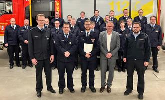 Vordere Reihe: Stv. Wehrleiter Christian Fein (1. v. l.), Wehrführer Nils Ahlborn (2. v. l.), Ortsbürgermeister Thomas Kloft (2. v. r.), Wehrleiter Tobias Haubrich (1. v. r.) freuen sich mit dem neu gewählten stv. Wehrführer Pierre Rüdel (Bildmitte)