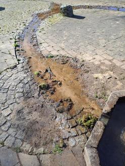Durch das Herausnehmen der Steine entstehen Schäden am Pflaster, die anschließend wieder aufwendig behoben werden müssen. Wir bitten daher eindringlich darum, die Steine im Boden zu belassen und mit dem Bereich rund um den Brunnen sorgsam umzugehen.