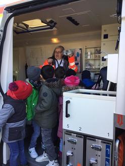 Ein Teil der Gruppe hatte zuerst die Möglichkeit, den Krankenwagen aus nächster Nähe zu betrachten. Unter Anleitung einer erfahrenen Sanitäterin konnten die Kinder die verschiedenen Geräte und Ausstattungen des Fahrzeugs kennenlernen. Anschaulich wurde erklärt, wie die medizinischen Geräte funktionieren und welche Rolle sie im Notfall spielen.