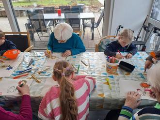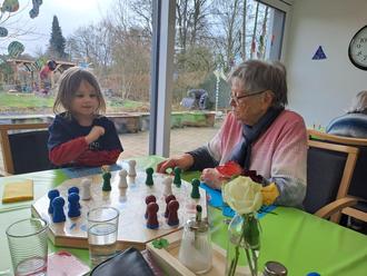Um sich besser kennenzulernen, haben sich sowohl die Senioren als auch die Seniorflöhe ein Begrüßungslied gegenseitig vorgesungen. Im Anschluss daran haben wir gemeinsam noch das „Gute-Laune-Lied“ getanzt. Das engagierte Pflegeteam hatte an diesem Vormittag in ihrer Einrichtung einen Bewegungsparcours und eine Malaktion vorbereitet. Die Senioren und die Seniorflöhe bildeten dafür Teams. „Jung“ sowie „Alt“ hatten dabei eine Menge Spaß. Schön zu beobachten war der fürsorgliche und geduldige Umgang, den die Kinder mit den Senioren hatten. Der Besuch in der Tagespflege endete mit einem gemeinsamen Mittagessen.