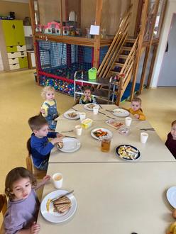 Auch beim gemeinsamen Frühstück vorbereiten waren die Kinder mit viel Begeisterung dabei. Es wurde Brot geschmiert, Gurken geschnitten und bunte Sandwiches gestaltet. Manch ein Brot sah danach fast zu schön aus, um es zu essen, aber nur fast. Am Ende wurde natürlich alles mit großem Appetit verspeist.