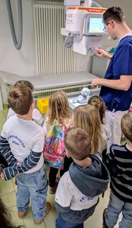 Weiter folgte eine spannende Führung durchs Labor. Wir haben zusammen eine Plüschkatze geröntgt und der Arzt nahm sich besonders viel Zeit, den Kindern, die besonders mutig waren, ein Ultraschall ihres eigenen Herzens zu ermöglichen.