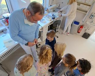 Weiter ging es ins Labor, wo man zuschauen durfte, wie an künstlichen Zähnen gearbeitet wurde. Danach führte der Rundgang ins Behandlungszimmer, wo jedes Kind auf dem Stuhl Platz nehmen durfte. Wie durch Zauberei bewegte dieser sich nach oben und unten, was den Kindern große Freude bereitete.