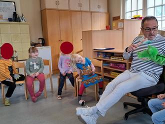 Auch das Wasser lief aus dem Wasserhahn, sobald man in die Hände klatschte. Nach der ganzen Zauberei und vielen lehrreichen Eindrücken ging es mit dem Bus zurück zur Kita. Am 22. März besuchte uns Dr. Decker dann im Stuhlkreis. Mit dabei war sein Krokodil vom Nil, an welchem er das richtige Zähneputzen demonstrierte. Aufmerksam verfolgten die Kinder, was es zu erzählen gab und konnten die Fragen des Zahnarztes richtig beantworten. Ein reger Austausch begann. Zum Abschluss sangen die Kinder noch ein Lied und es gab ein Zahnputz-Set als Geschenk. Alle waren begeistert und freuen sich schon auf den nächsten Besuch.