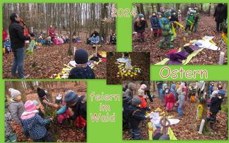 Am Gründonnerstag, 28. März 2024 feierten die Kindergartenkinder ihr Osterfest auf ihren Waldplätzen. Für die gemeinsame vorösterliche Feier unter freiem Himmel im Wald wurde Pastoralreferent Matthias Scherer eingeladen. Die Dinos und Mini-Dinos Kinder haben dort die Ostergeschichte erzählt und mit vielen österlichen Symbolen dargestellt. Gemeinsam wurden Osterlieder und „Stups der kleine Osterhase“ gesungen. Im Anschluss hat jede Gruppe ein Holzkreuz auf ihrem Waldplatz geschmückt. Mit vielen Handabdrücken wurde erkennbar, dass am Ende Ostern doch ein freudiges und buntes Fest ist.