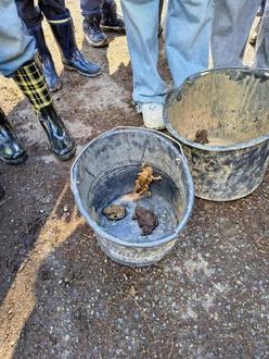 Als wir am Fangzaun angekommen sind, haben wir in den Eimern insgesamt zehn Erdkröten entdeckt. Es war ein tolles Gefühl, diesen Tieren helfen zu können, indem wir sie sicher über die gefährliche Straße zu ihrem Laichgewässer gebracht haben. Dort angekommen, haben wir noch einige weitere Erdkröten und sogar einen Grasfrosch entdeckt, die bereits auf unser Mitbringsel gewartet haben.