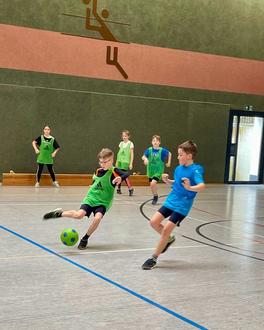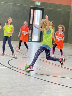 Unter dem Motto „Spielen und Bewegen mit und ohne Ball“ fand unter der Leitung zweier DFB-Mobil-Teamer eine abwechslungsreiche Unterrichtsstunde statt, bei der auch die Lehrerinnen während des Praxisteils konkrete Anregungen für das entwicklungsgerechte Spielen und Üben im Kinderfußball erhielten.