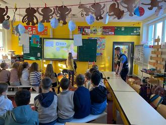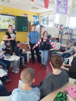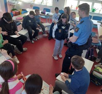 Die Beamten informierten auch darüber, welche Gefahren im Internet lauern oder bei der Verwendung verschiedener Medien bzw. Apps. Zum Abschluss durften die Kinder Fragen stellen und wer mochte einmal die Polizeiweste anprobieren. Viele nutzten die Gelegenheit, um mehr über die Polizeiarbeit zu erfahren. Der Besuch der Polizei war ein lehrreiches und spannendes Erlebnis für alle Kinder.