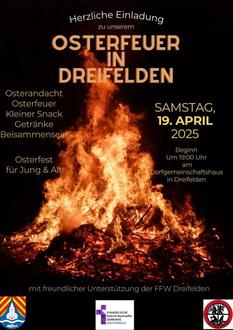 | Dreifelden | 19:00 Uhr | Dorfgemeinschaftshaus -Osterfeuer- |