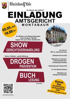 Einladung zu Show-Gerichtsverhandlung, Buchlesung mit KHK a.D. Jörg Schmitt-Kilian, Drogenprävention und mehr am Dienstag, dem 05.05. von 18.00 bis 20.00 Uhr im Amtsgericht Montabaur